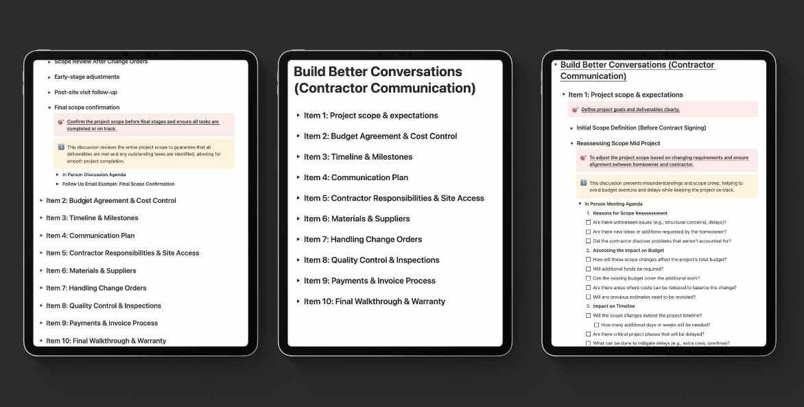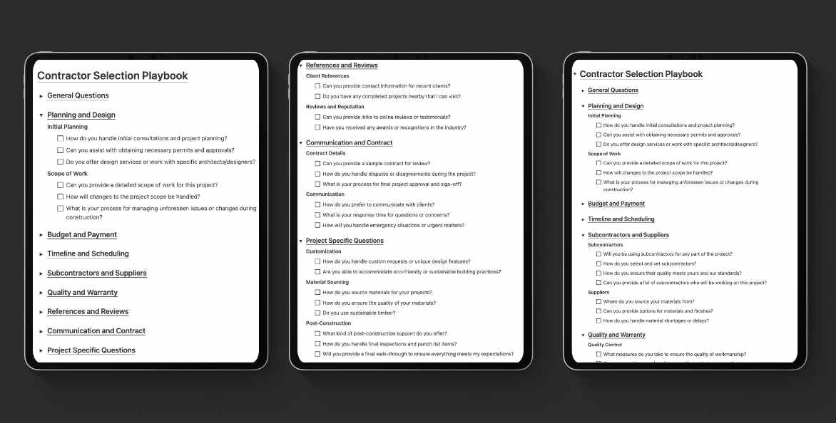 Professional systems for reviewing plans, organizing documents, analyzing quotes, and interviewing contractors.