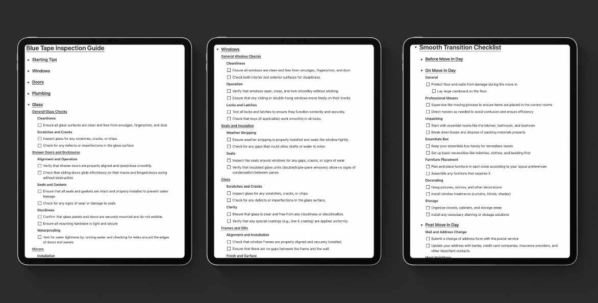 Professional inspection system and move-in checklist. Catch hidden flaws before final payment. Transform move-in day from chaos to smooth transition.