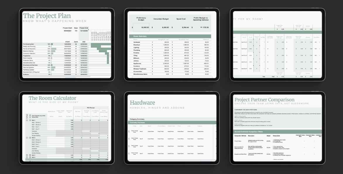 Complete single room project system with built-in calculator for materials, real-time budget tracking, and pre-loaded task list. Perfect for room renovations, additions, or converting existing spaces.